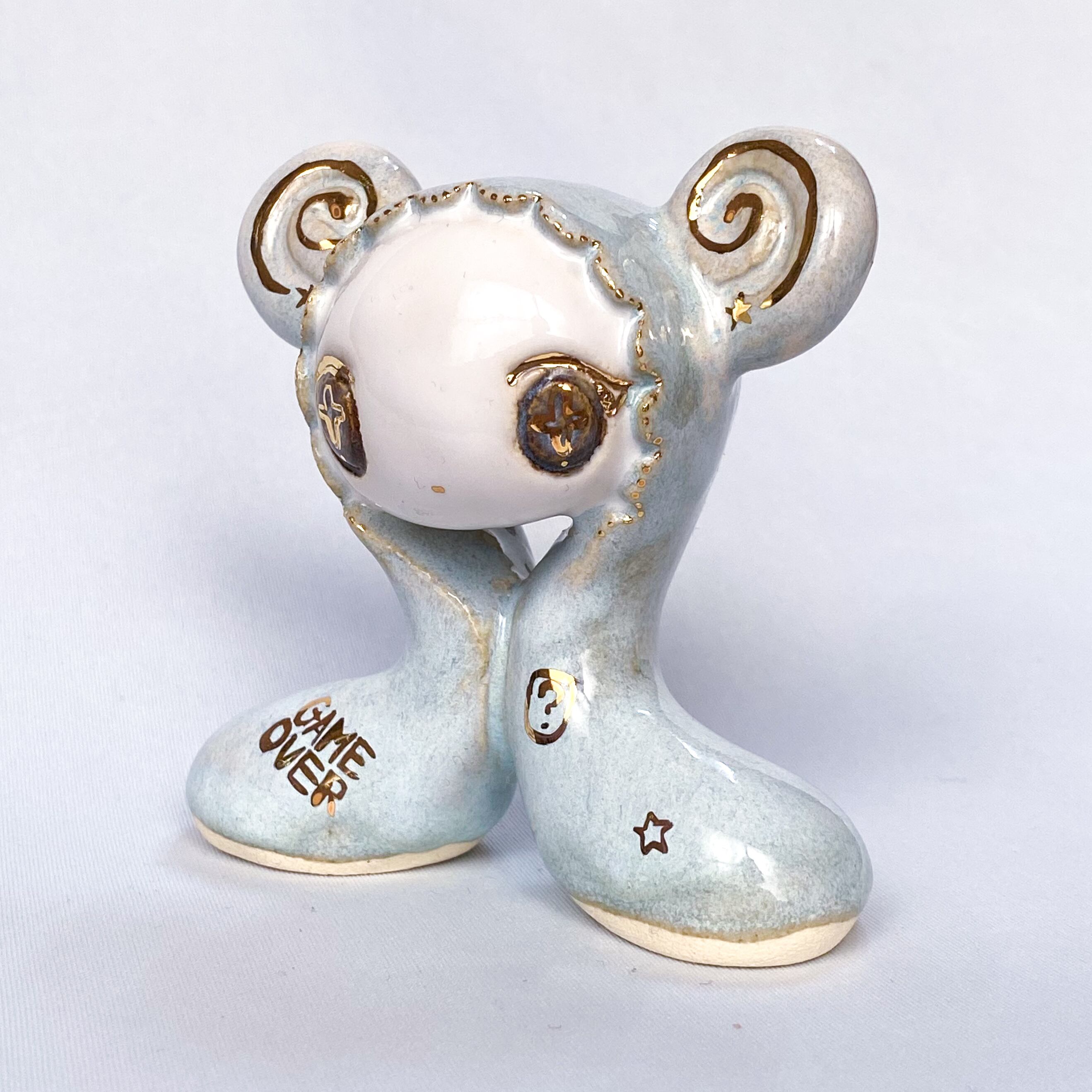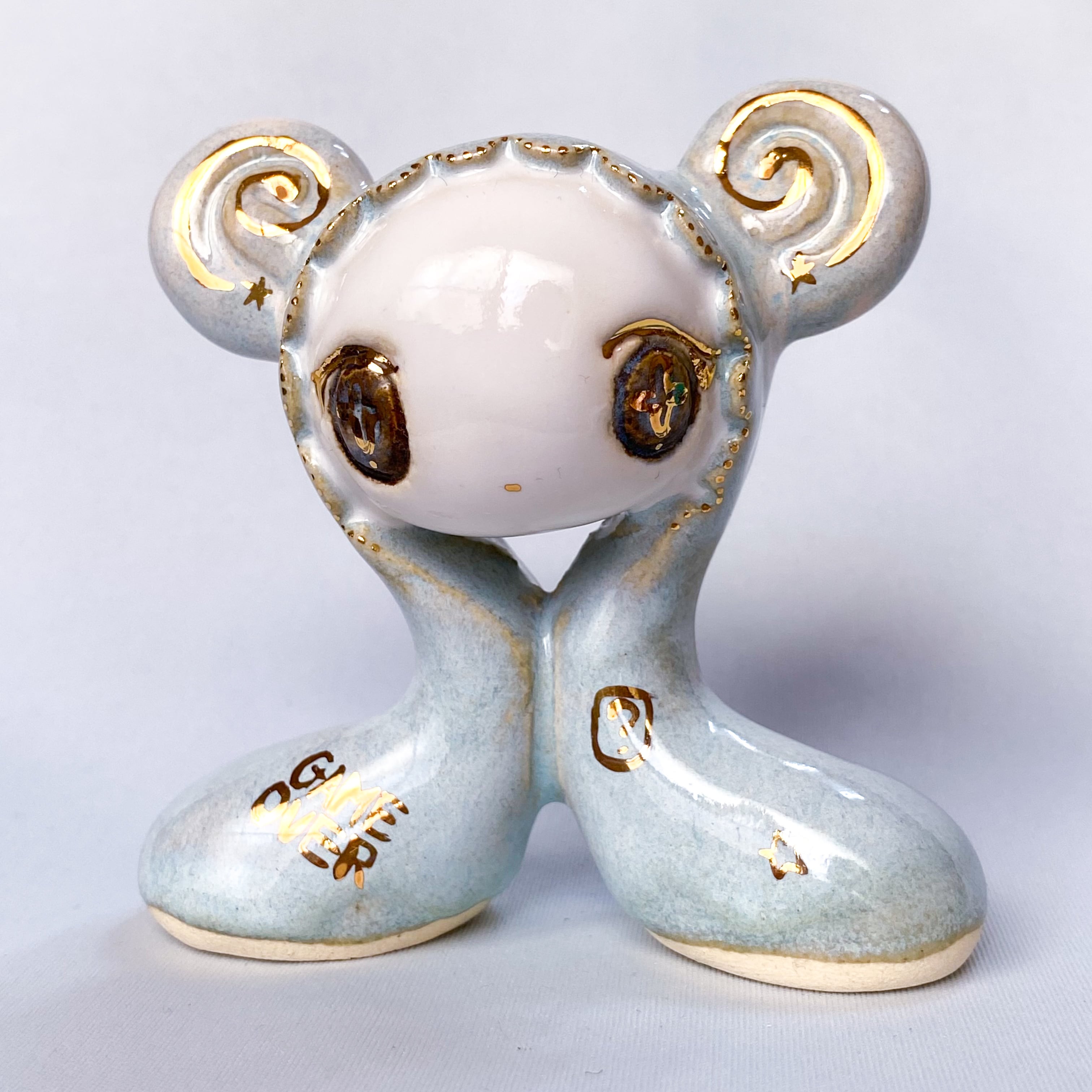 手びねりでひとつひとつ造形し、釉薬をかけたあと金彩で目や模様などを描いています。