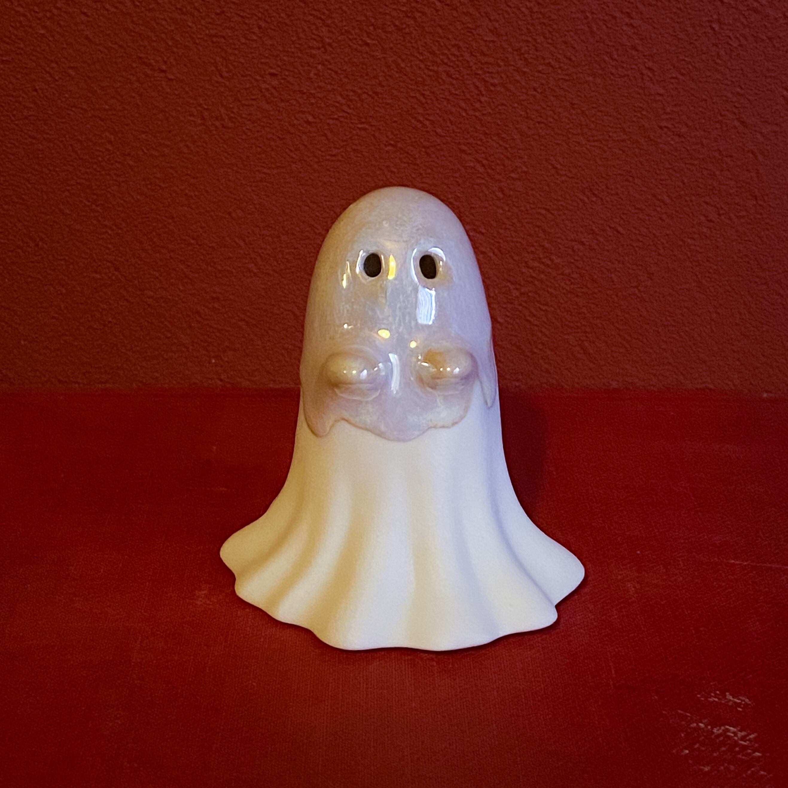 磁器製のちいさな幽霊のオブジェです。磁器にオーロラ釉薬を施し、姿を消す寸前のような赴きです。
