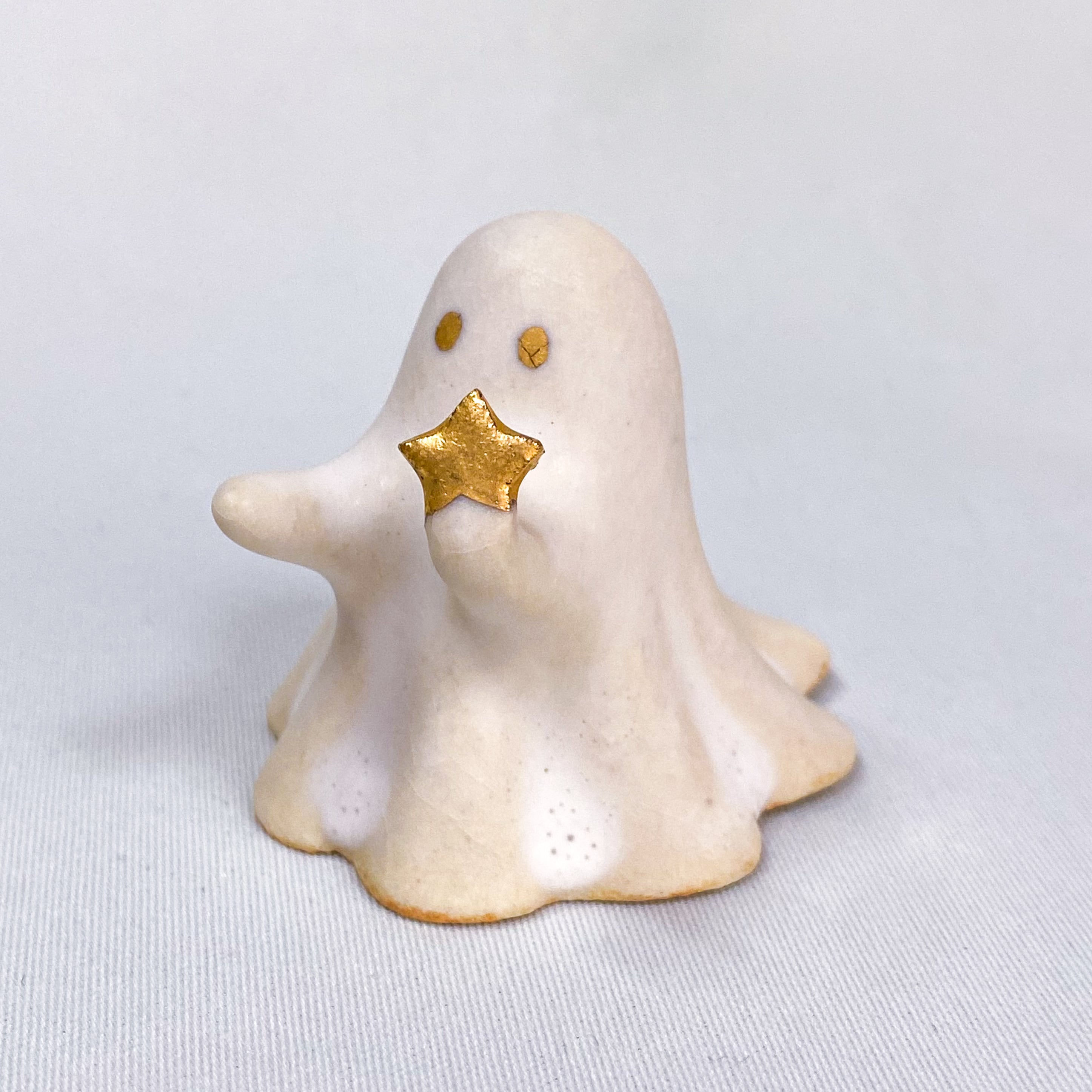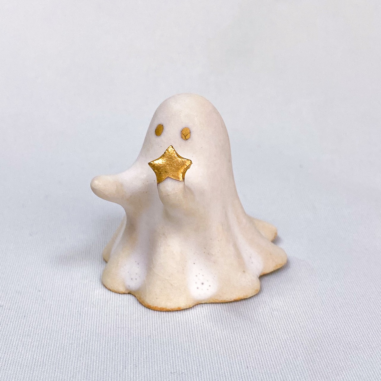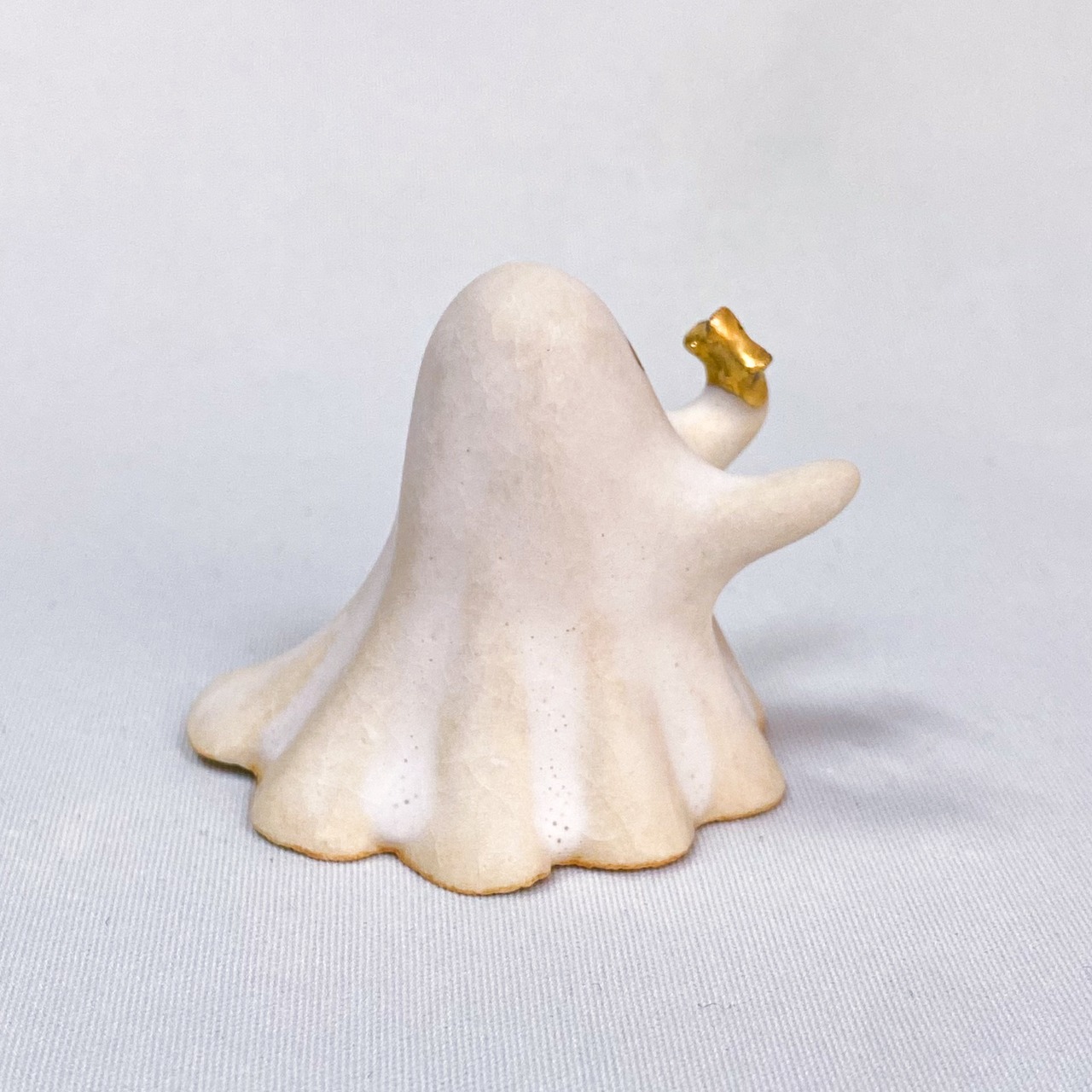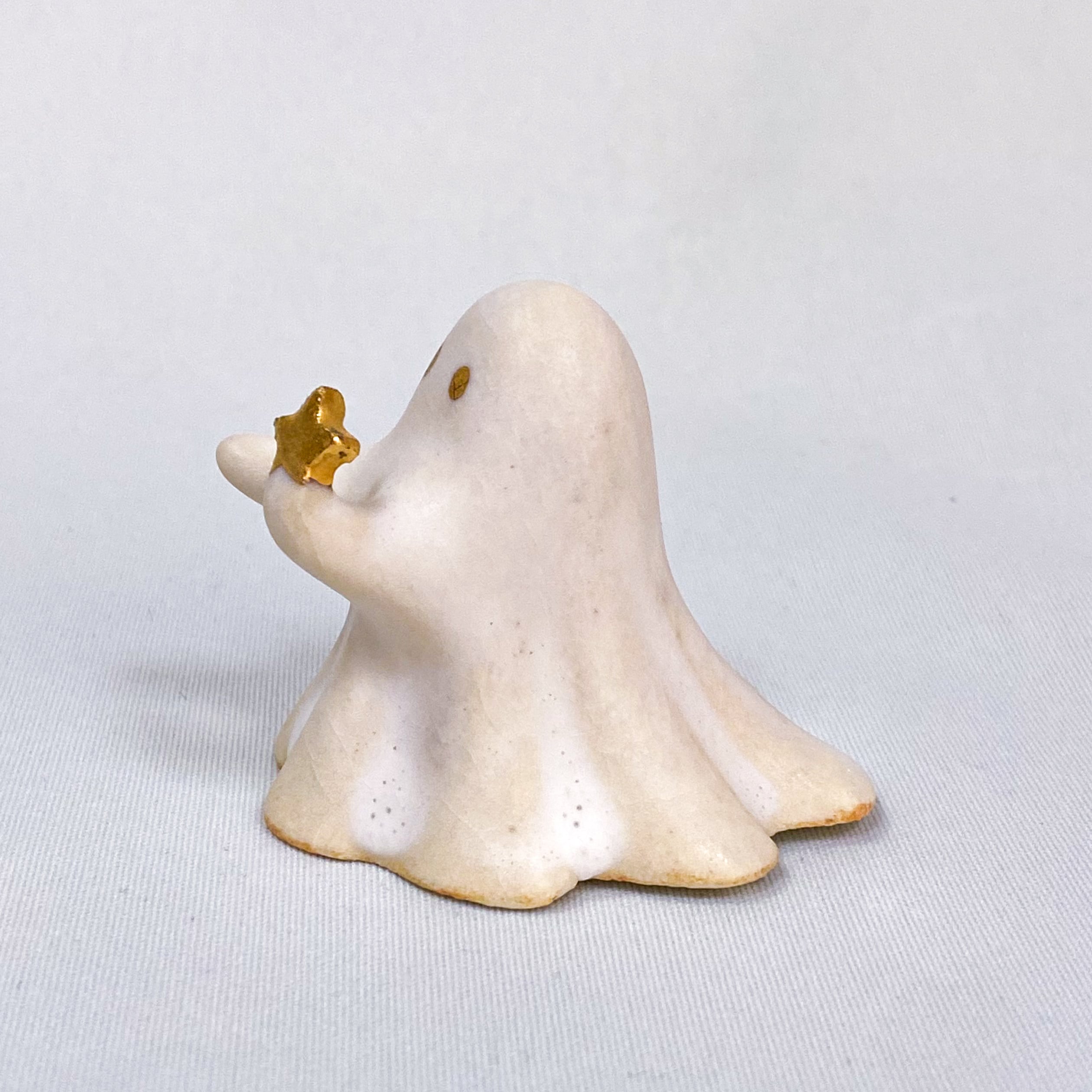 陶器製のちいさな幽霊のアクセサリーピローです。きらきらの星を持たせ、金彩でホリデーな雰囲気に仕上げました。