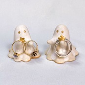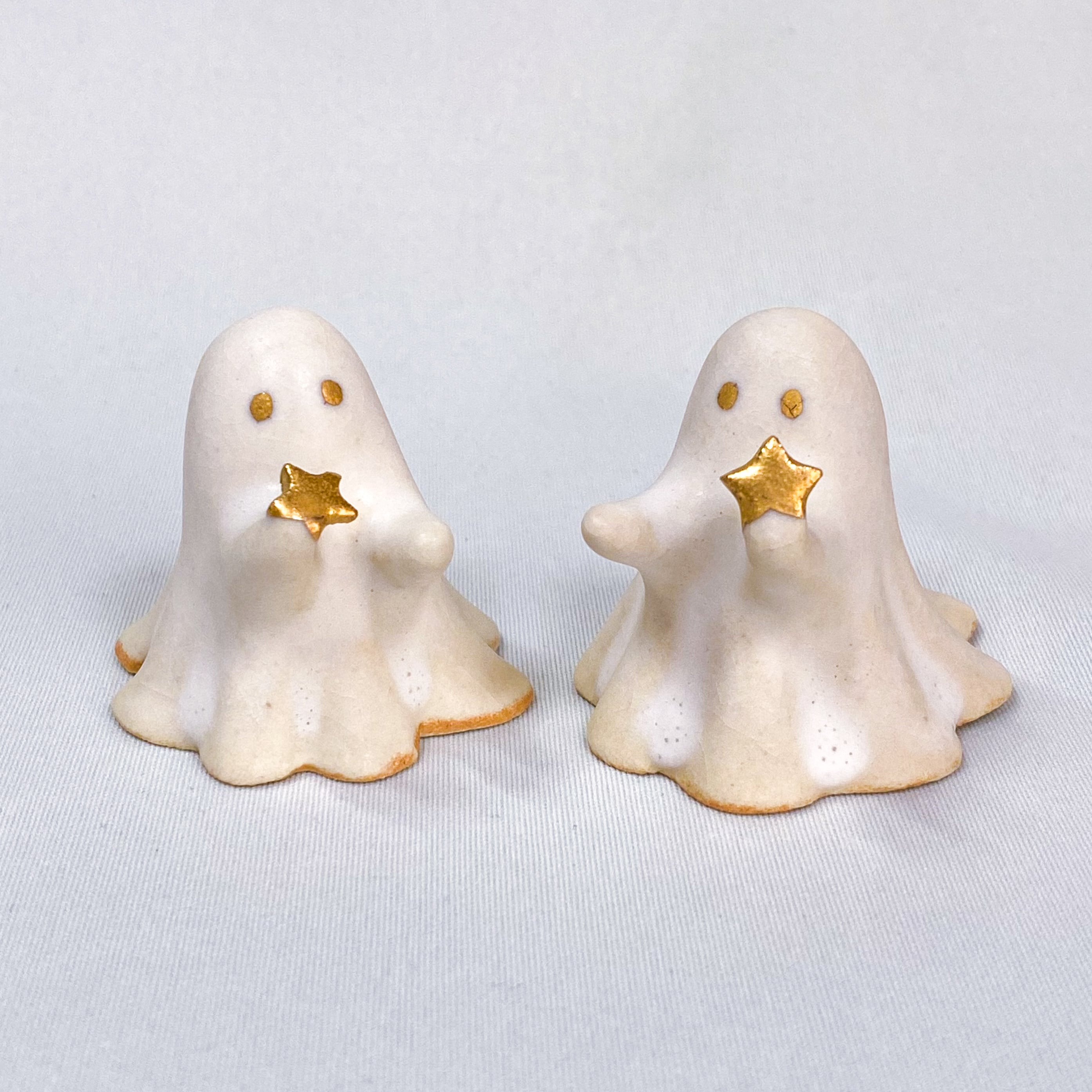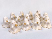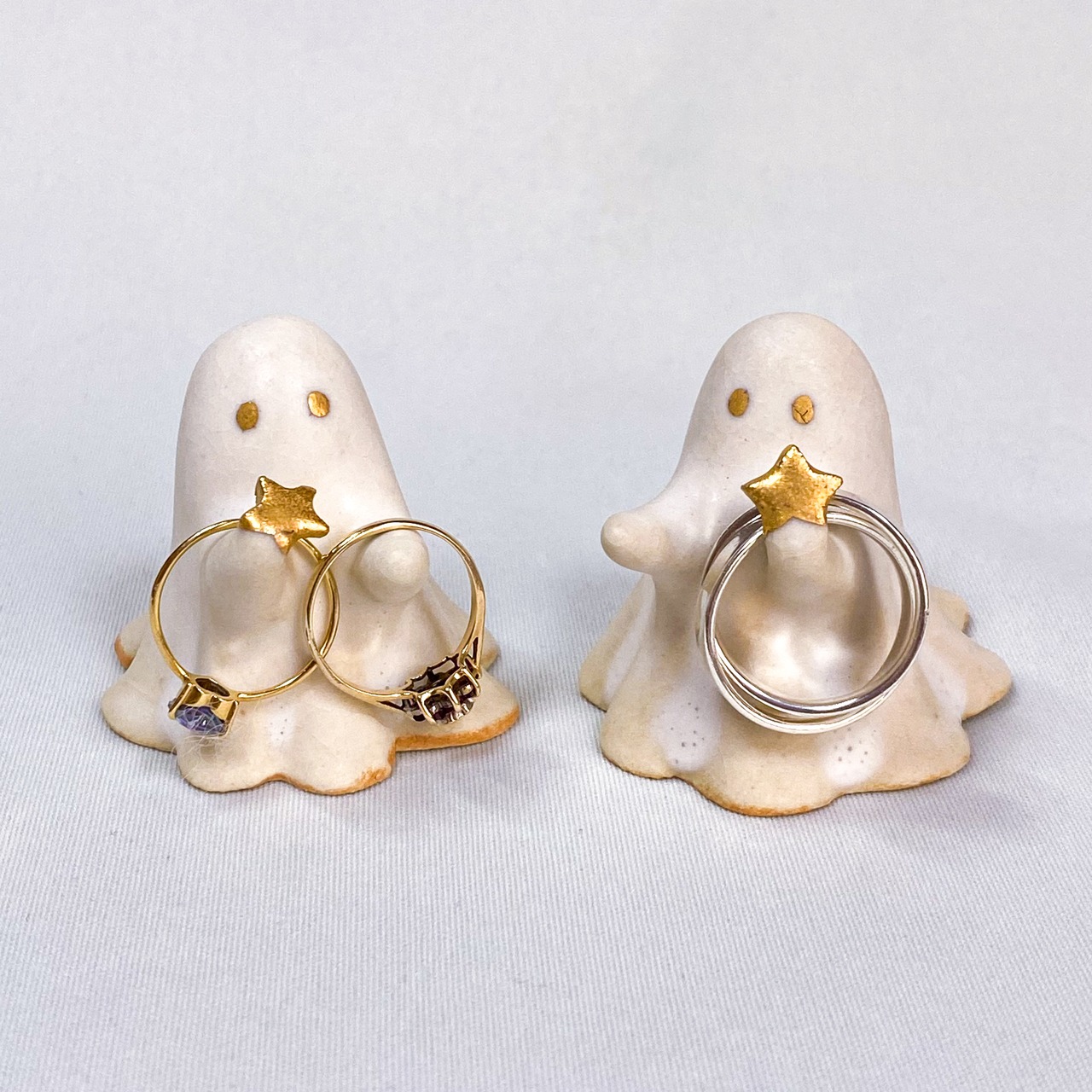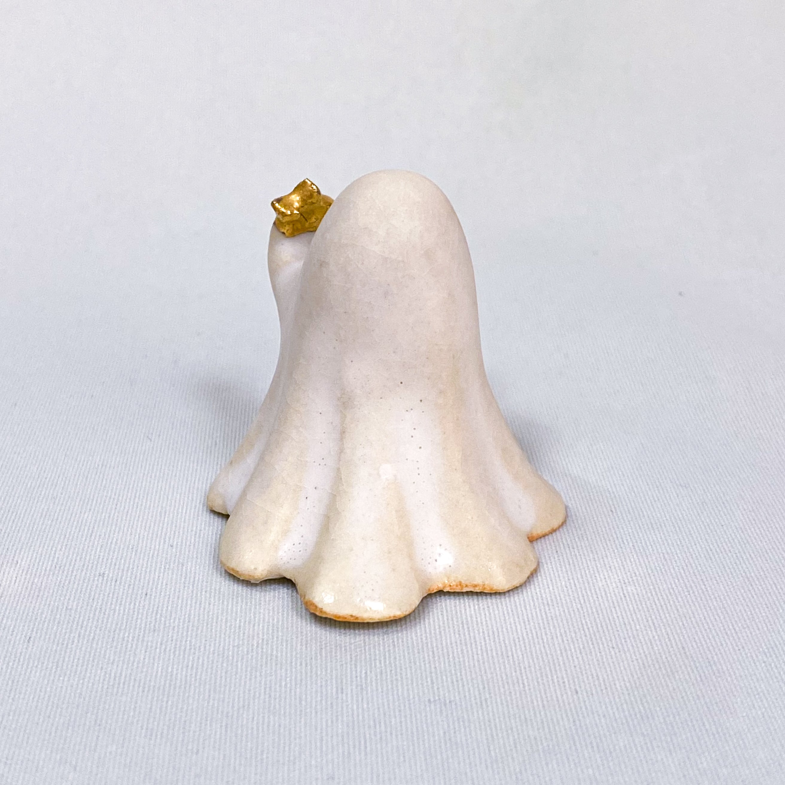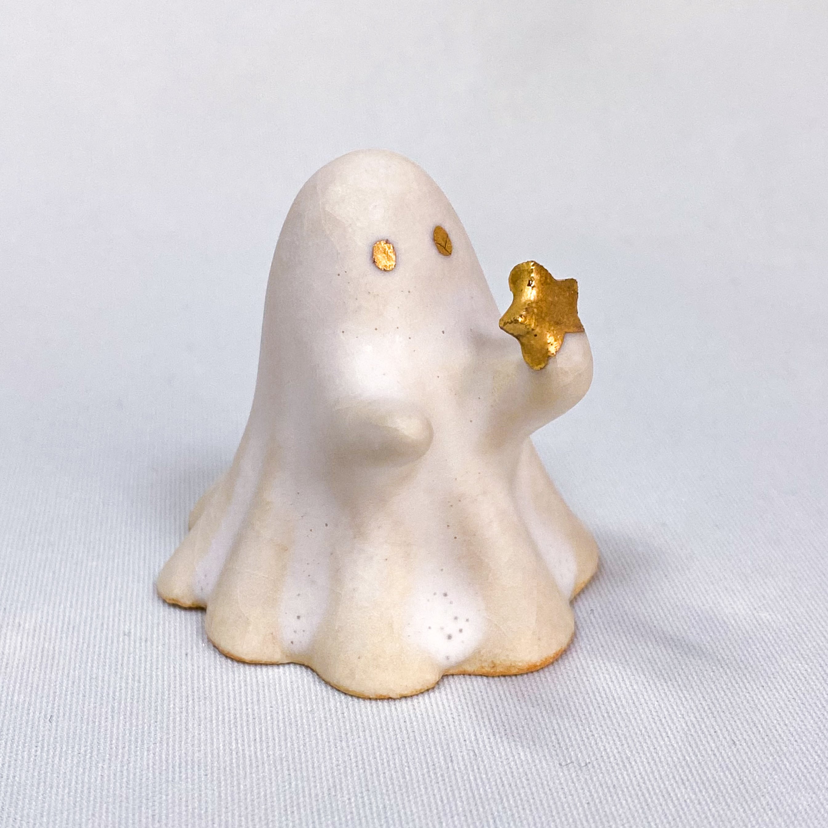 陶器製のちいさな幽霊のアクセサリーピローです。きらきらの星を持たせ、金彩でホリデーな雰囲気に仕上げました。